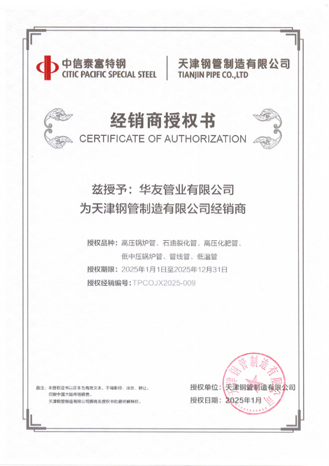 天津鋼管經銷商授權書
